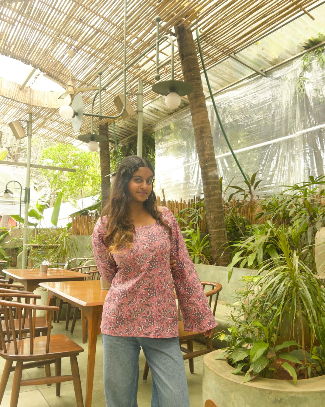 Featuring a flattering square neckline and dreamy bell sleeves, this kurti brings a fresh twist to classic desi wear. The soft pink floral print adds a romantic yet playful vibe, making it perfect for everything from morning classes and café dates to weekend strolls and family gatherings.