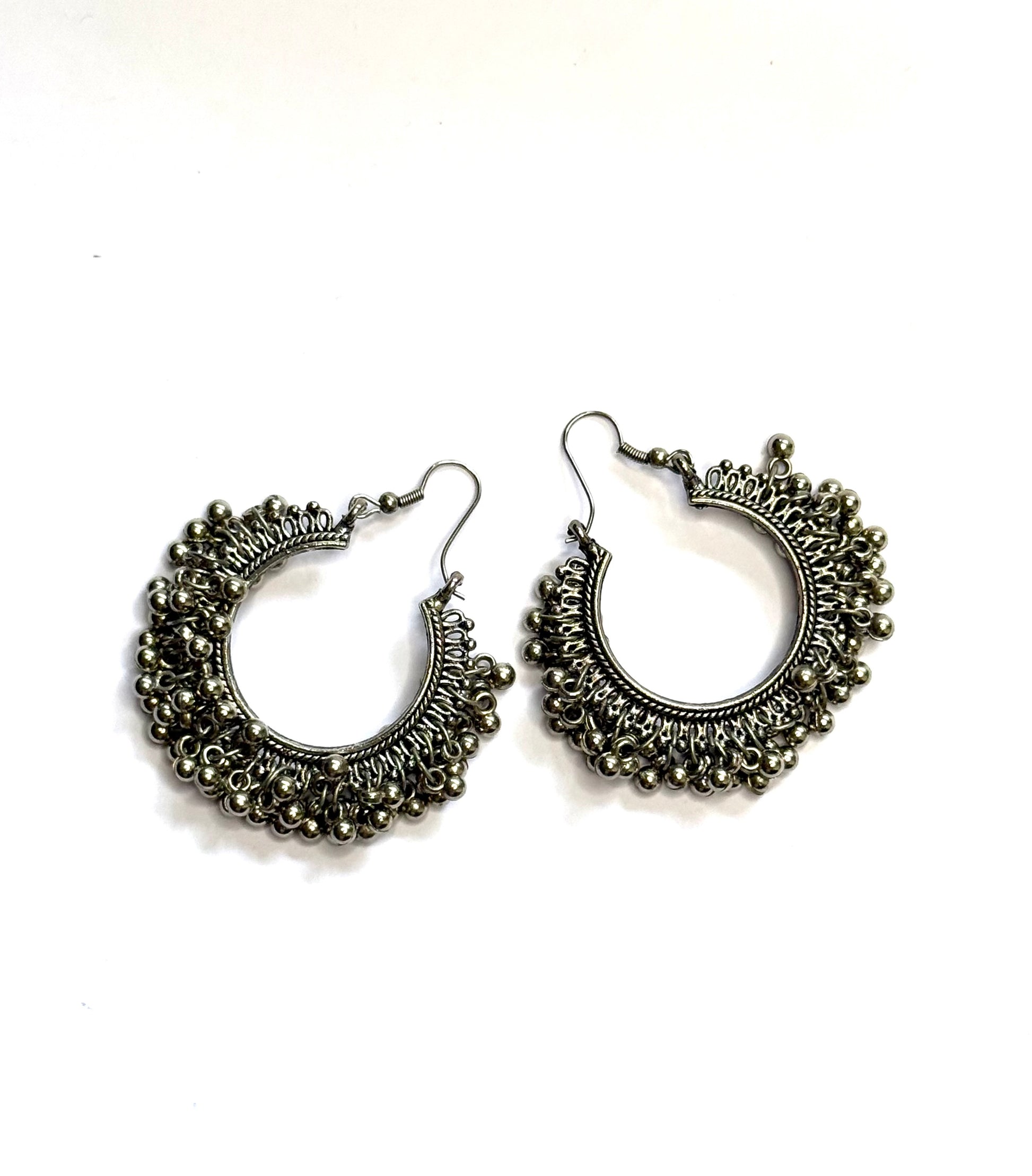 Circular hoop-style earrings with intricate metallic beadwork all around. The design is traditional yet versatile, suitable for casual and ethnic wear. They give a bold tribal vibe.