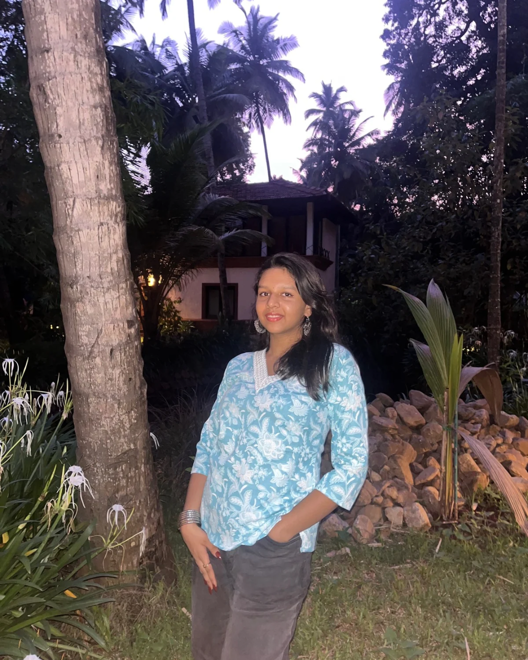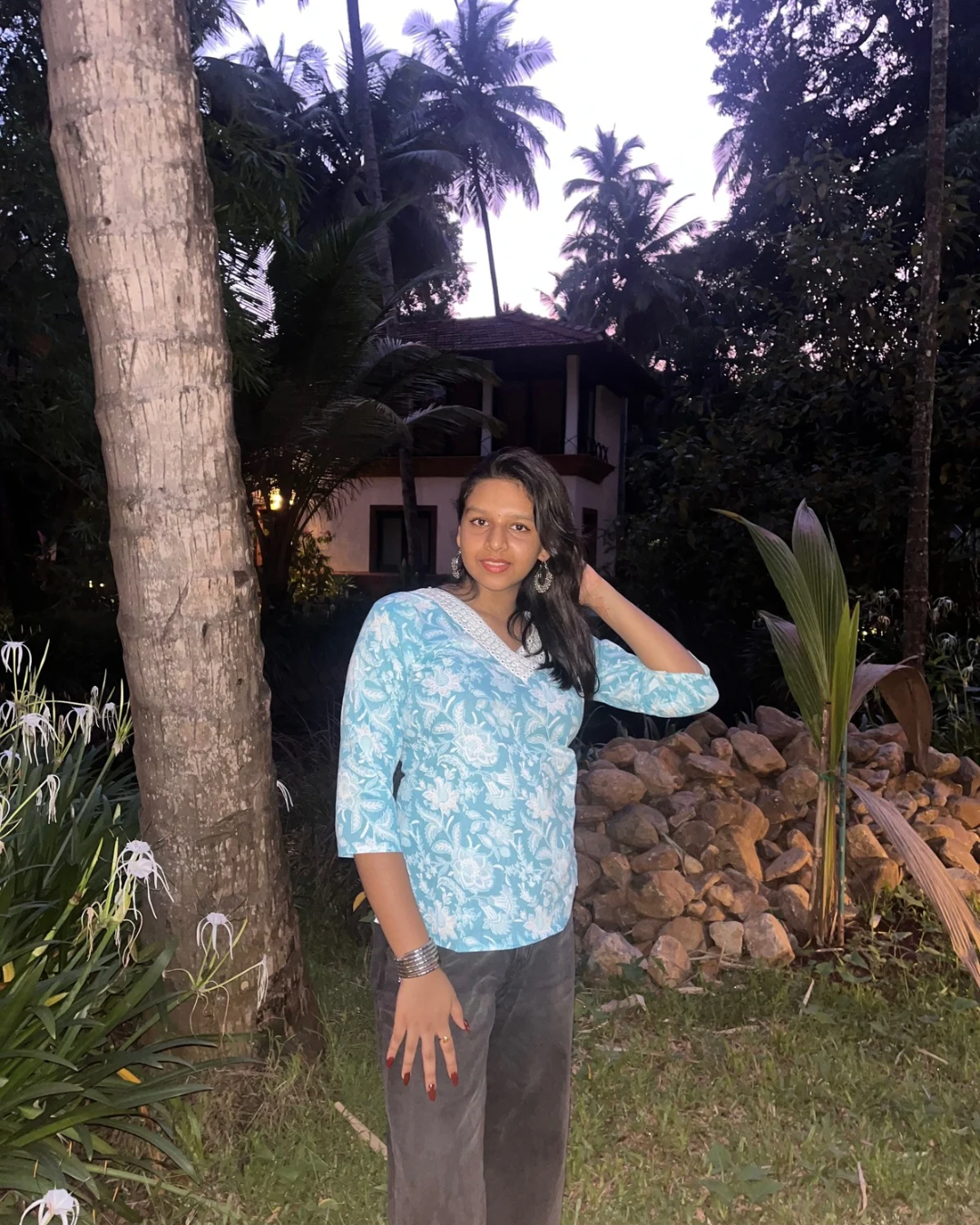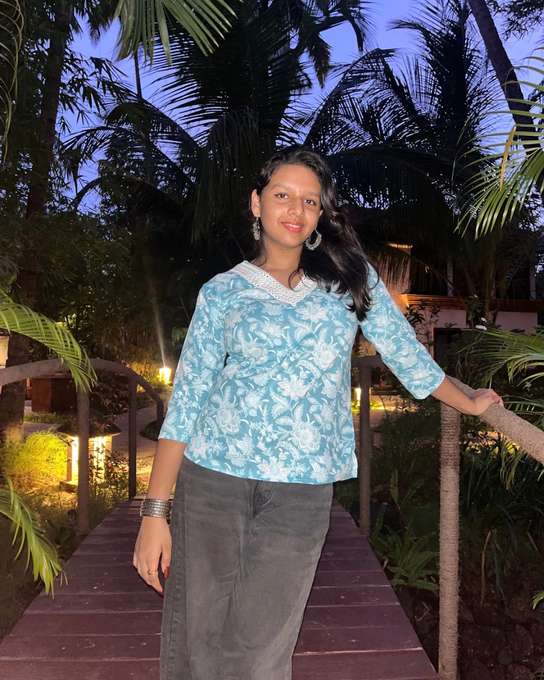 Wrapped in the calm of moonlight, Chandni is your go-to kurti for serene evenings and soft statements. With its soothing sky-blue floral print and delicately detailed neckline, it brings the charm of a peaceful night to your wardrobe. Style it with chunky silver hoops or oxidised bangles for that effortless Desi Pari glow.