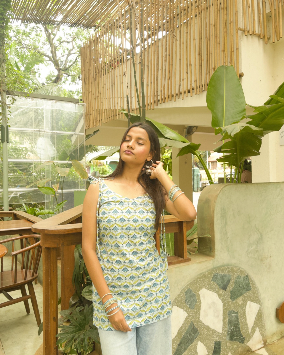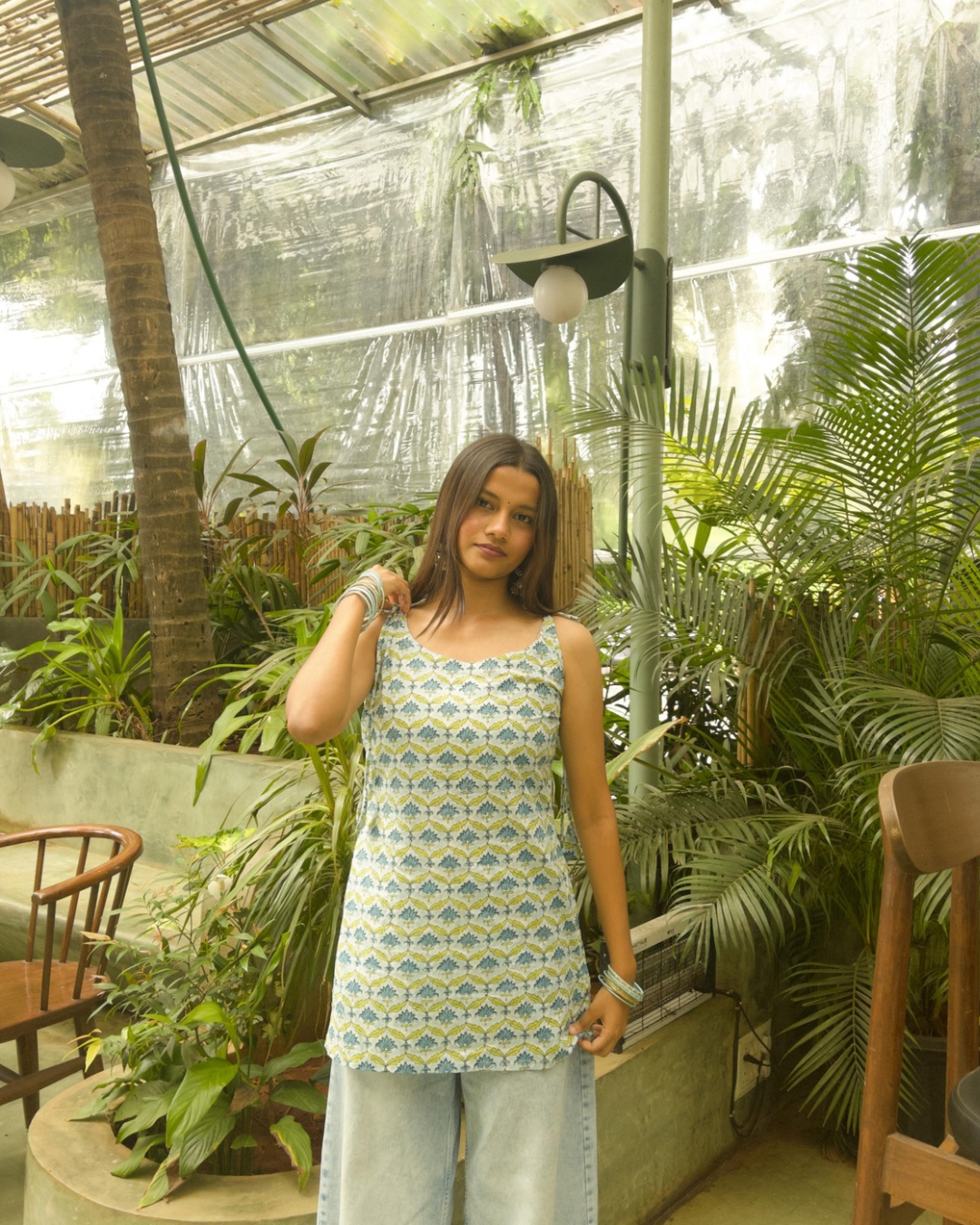 Say hello to Neel Tara — the kurti that’s all calm at first glance, but full of character when you look closer. With its breezy blue-green palette and playful desi print, this sleeveless piece is made for the girls who don’t follow trends — they start them.