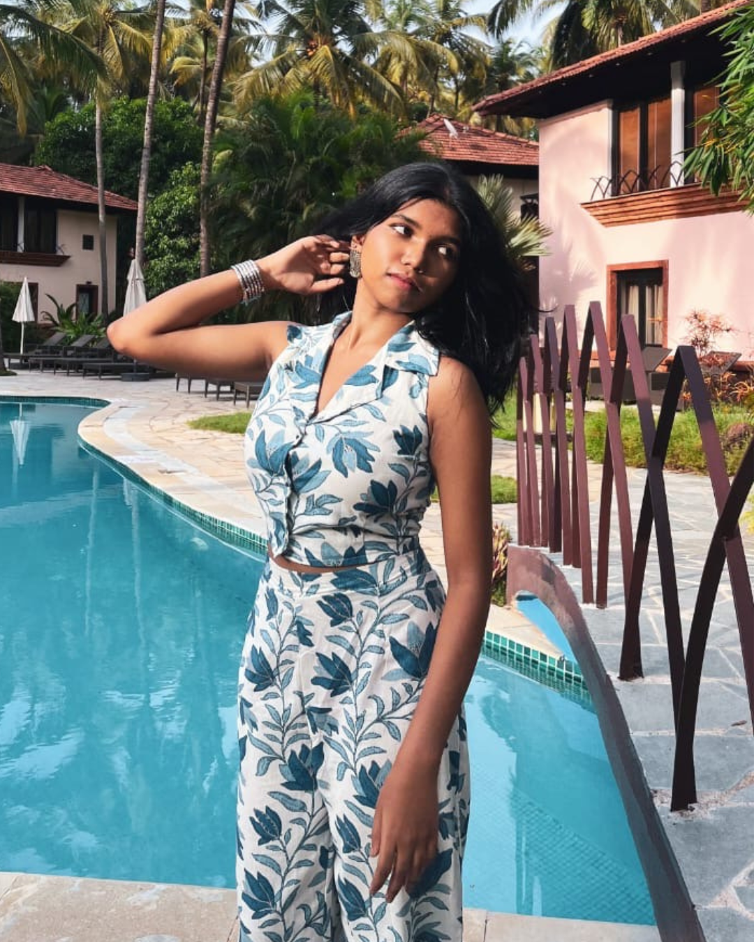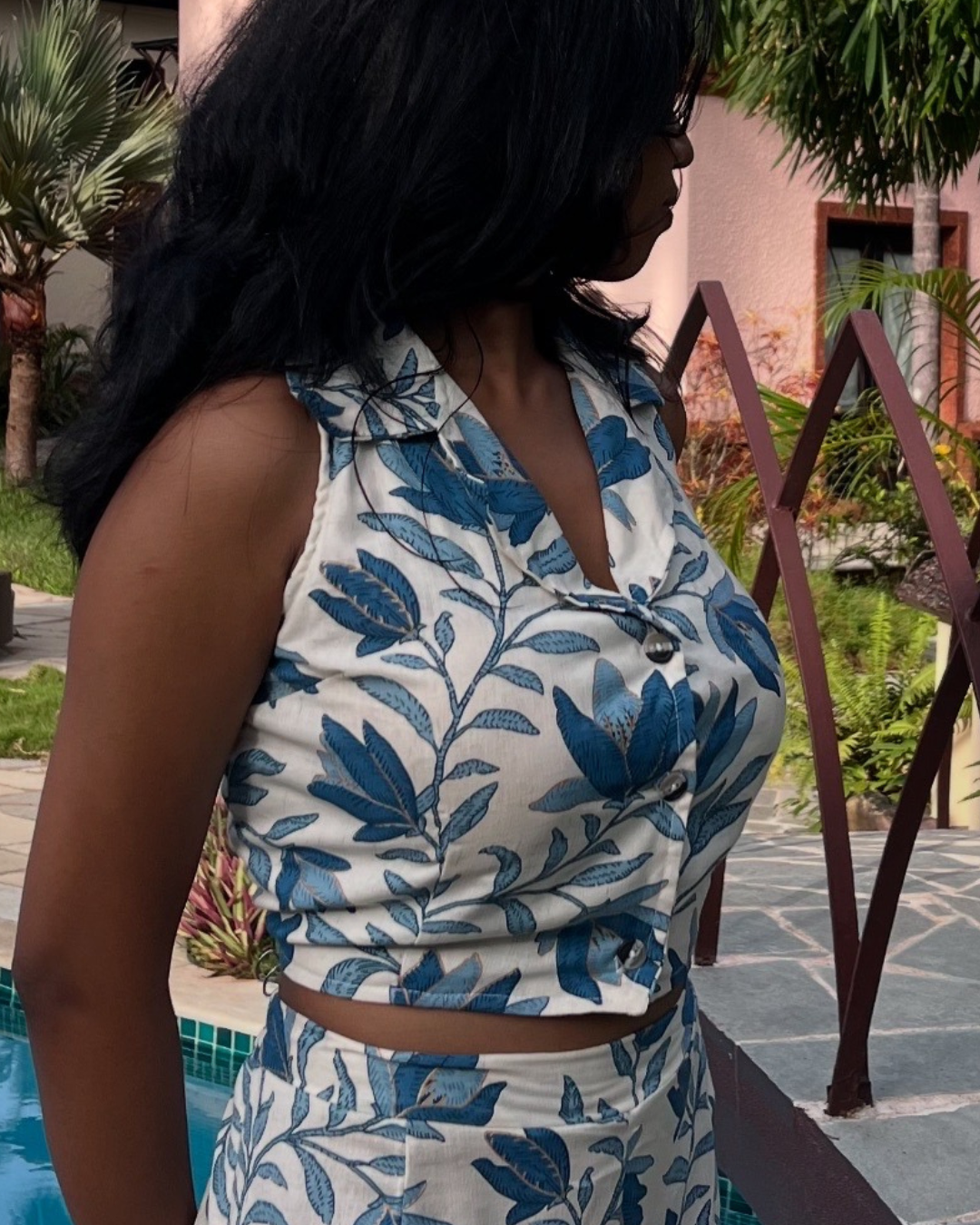 Drift into the calm of coastal winds with this soft cotton co-ord set, featuring an elegant leaf print in shades of ocean blue. The sleeveless button-down top pairs seamlessly with high-waisted bottoms, bringing together comfort and bold freshness. Perfect for sunny getaways, breezy brunches, or just when you want to feel like summer.