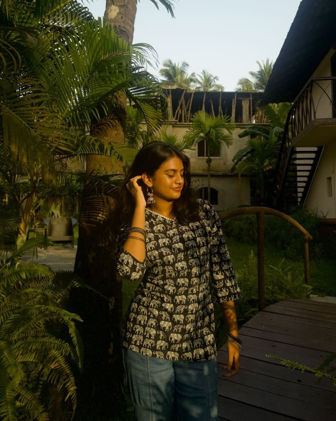 Not your regular soft girl kurti — Rani Haathi walks in with grace and a little drama. With powerful elephant prints on a classic black base, this one’s for the girl who carries tradition with edge. She’s strong, rooted, and always a little royal. Wear it when you want to feel grounded and unstoppable.