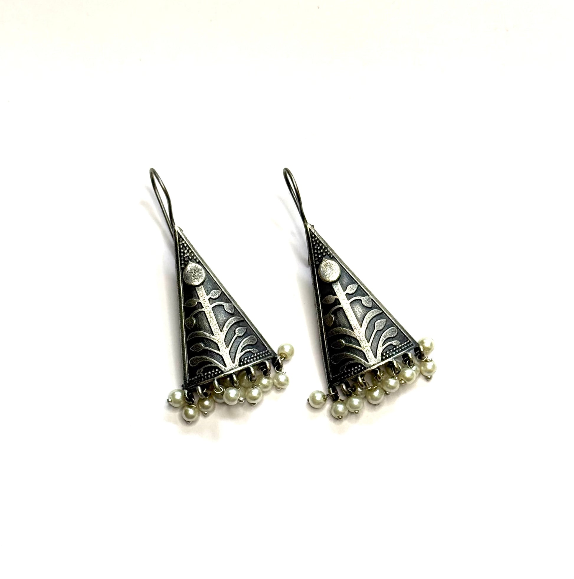 With a bold tribal face mask design, these oxidised earrings bring out strength and mystery. The circular, textured pattern makes them an edgy piece ideal for fusion and boho outfits.